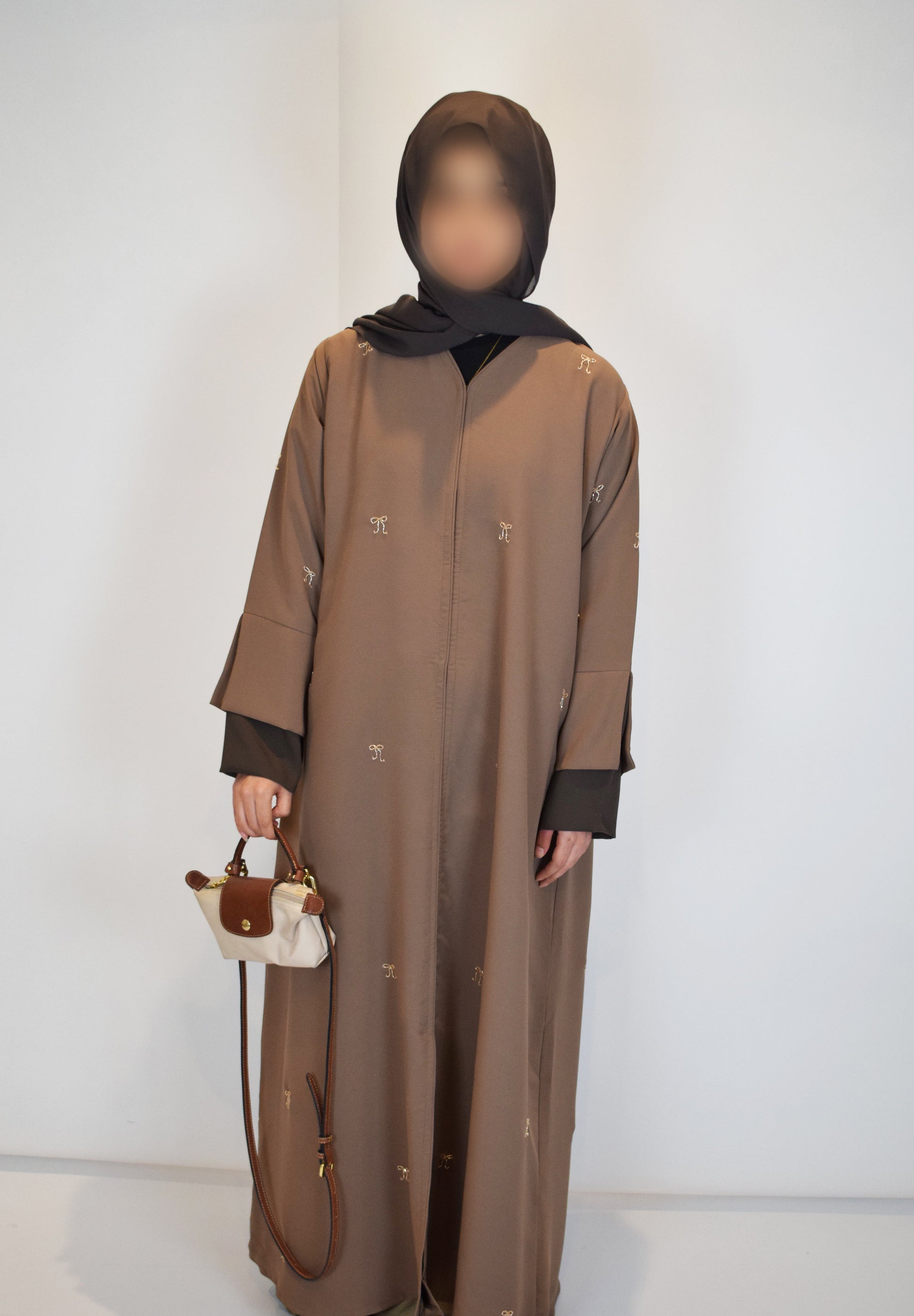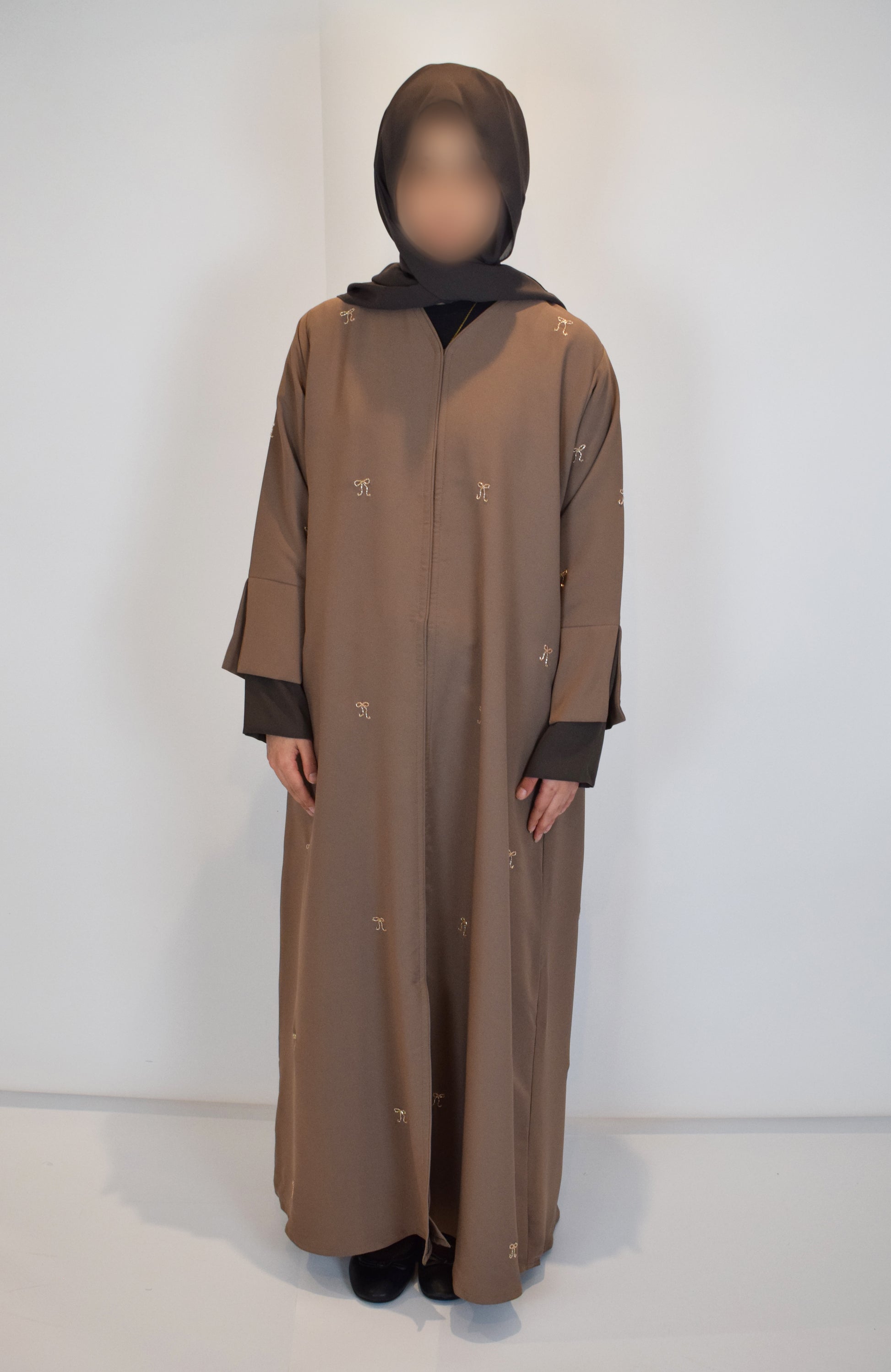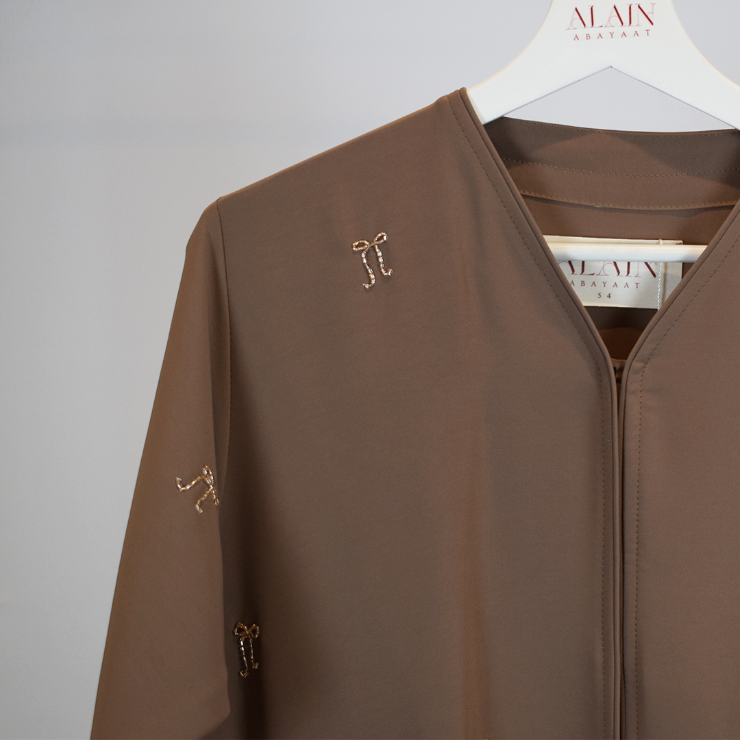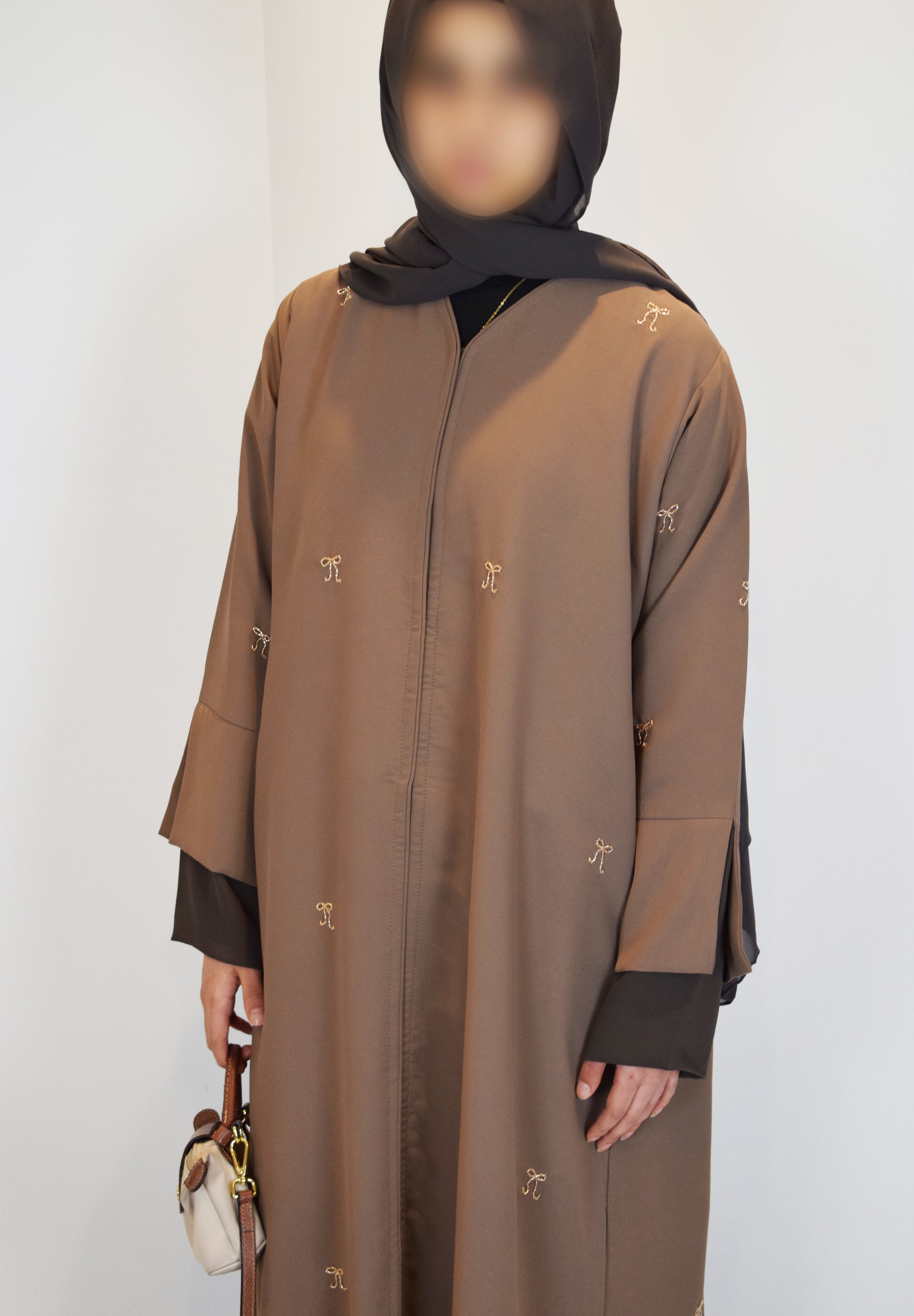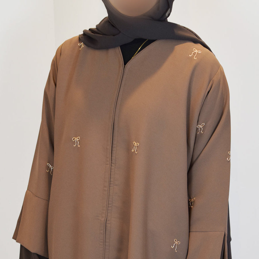 Expertly crafted, our Champagne Bow abaya features a high quality satin mink material that adds a luxurious touch to your closet. The champagne bow embellishments are unique and bring cottage-core into the world of abayas. The modest split sleeve cuff and closed design provides style and coverage. The champagne bow abaya comes with a chiffon chocolate brown hijab.