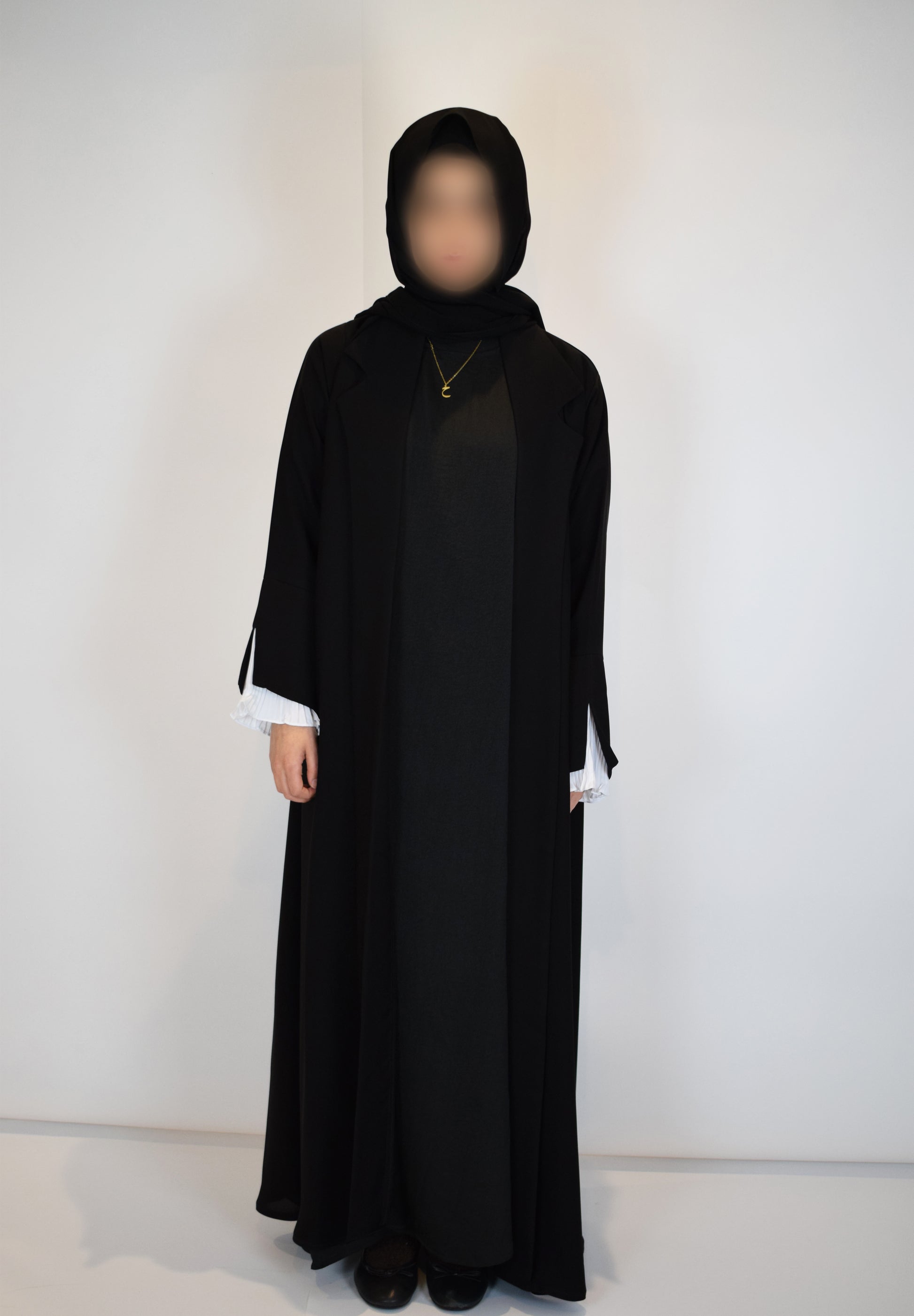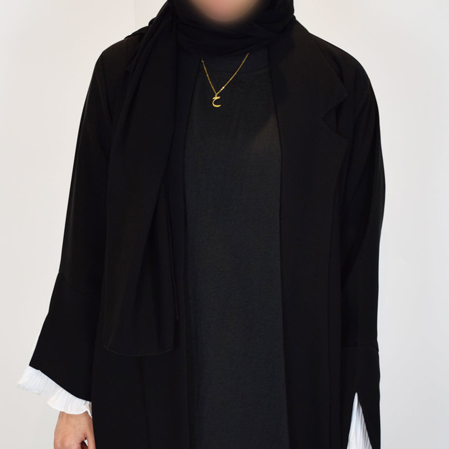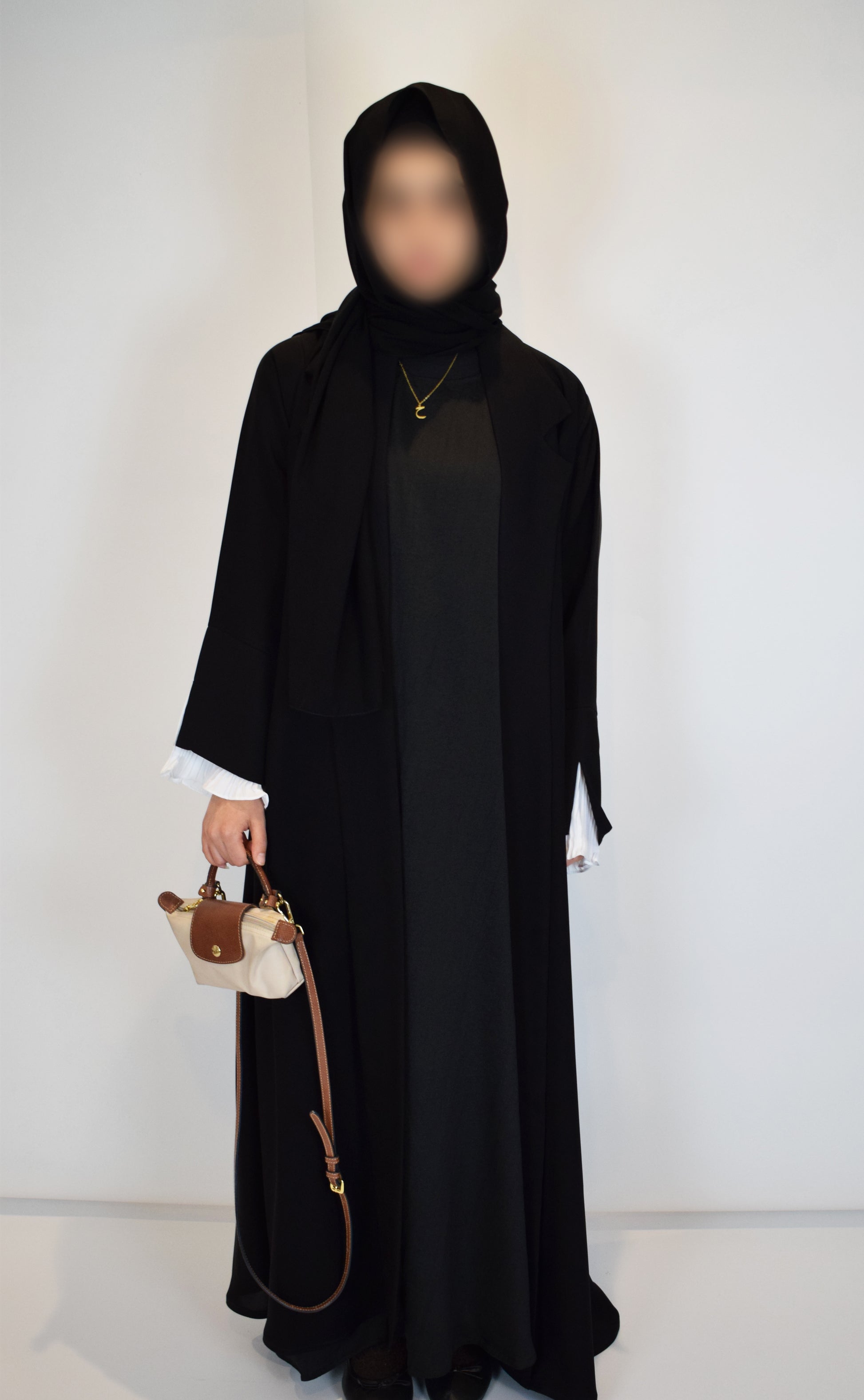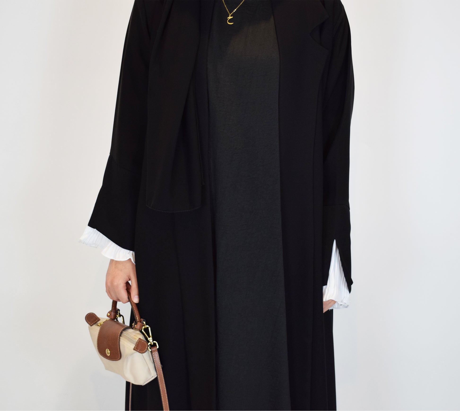Lina is an elegant black abaya with a white ruffled cuff and blazer collar, providing a relaxed style. The white ruffled cuff adds a touch of femininity, while the relaxed style allows for comfortable and effortless wear.